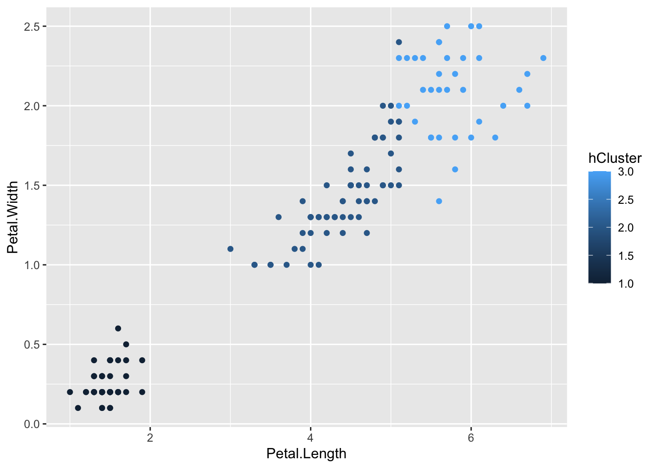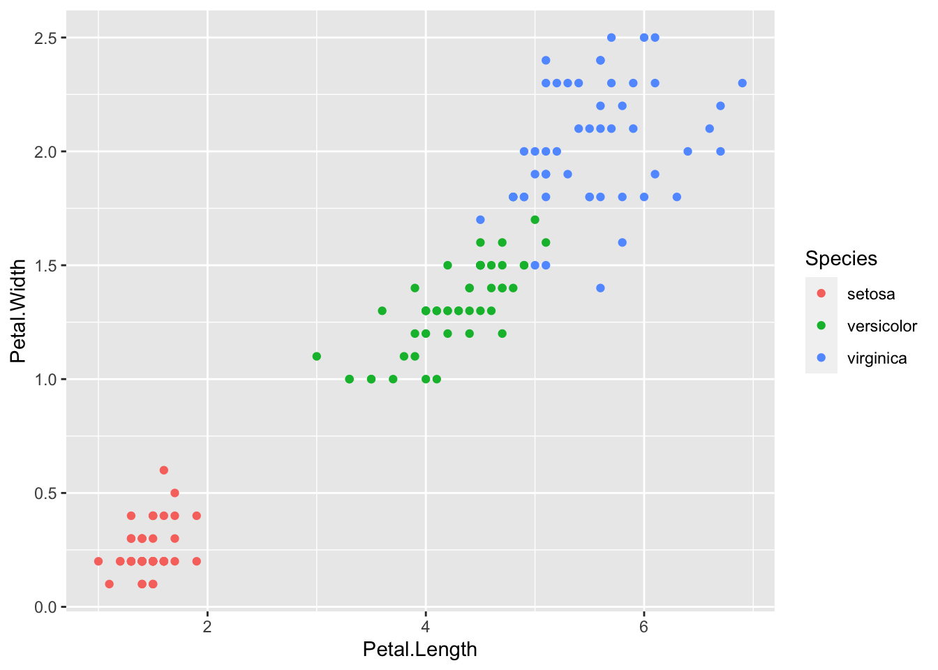 ggplot(iris, aes(Petal.Length, Petal.Width, color = Species)) + geom_point()
