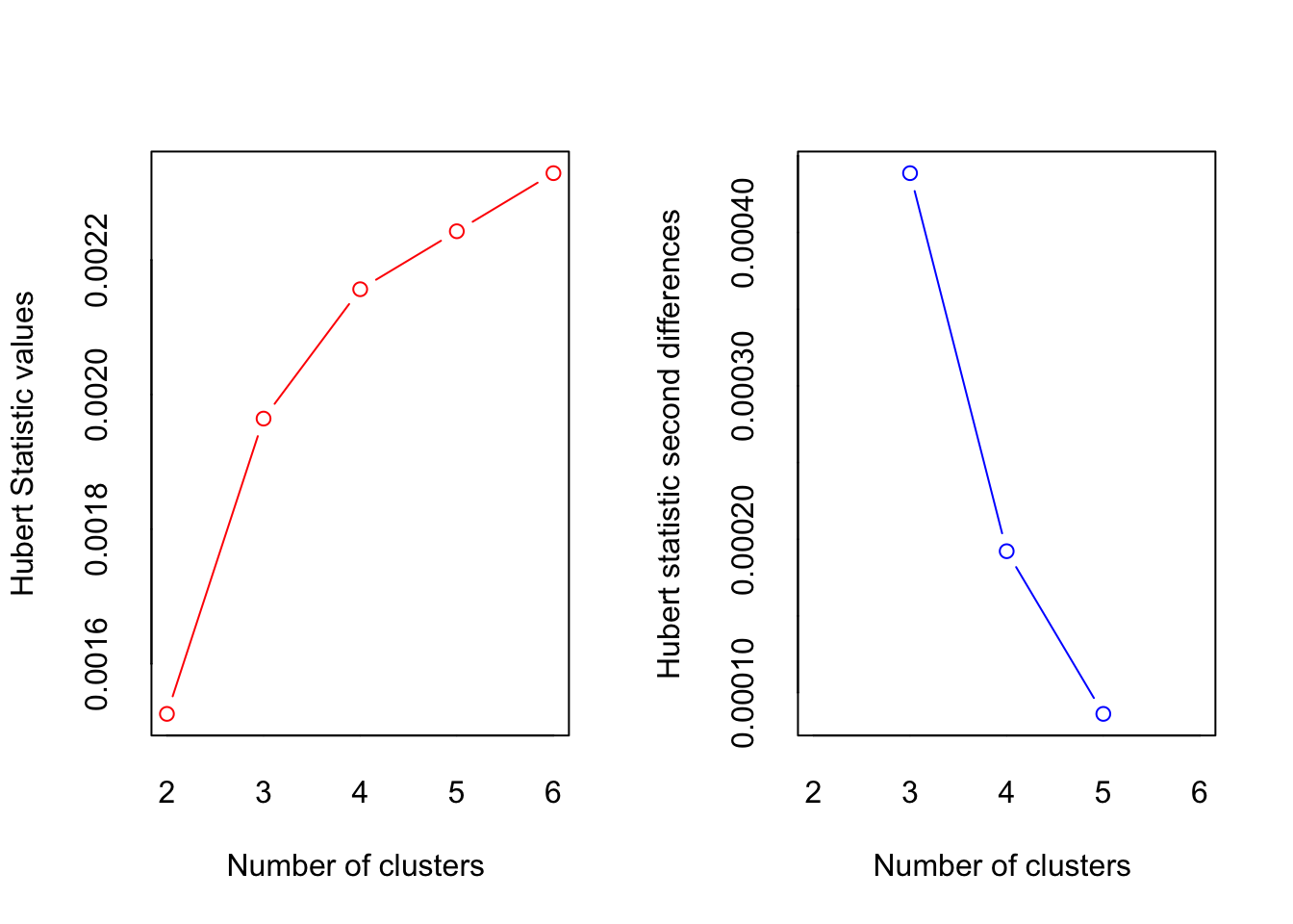 In the plot of Hubert index, we seek a significant knee that corresponds to a
