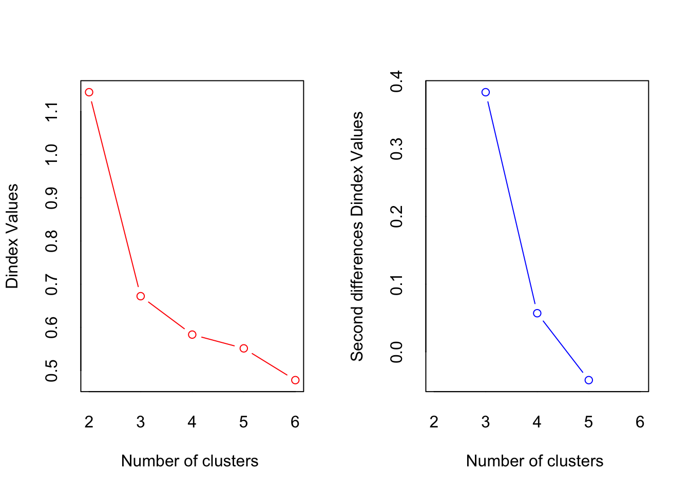 In the plot of D index, we seek a significant knee (the significant peak in Dindex