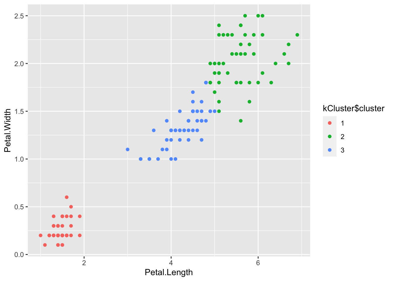 kCluster <- kmeans(iris[, 3:4], 3, nstart = 50) #3 clusters for the 3 species, nstart = 50 for 50 different random starts and select the model with lowest variation