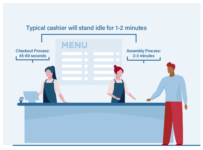 Assembly line restaurants commonly experience over staffing during down times and chronic under staffing during unexpected surges or labor shortages, resulting in either excessive labor costs or lost business. The heart of the problem is a bottleneck where the time taken to fulfill a customer’s order exceeds the time it takes for the customer to pay, leading to wasted labor and reduced productivity.